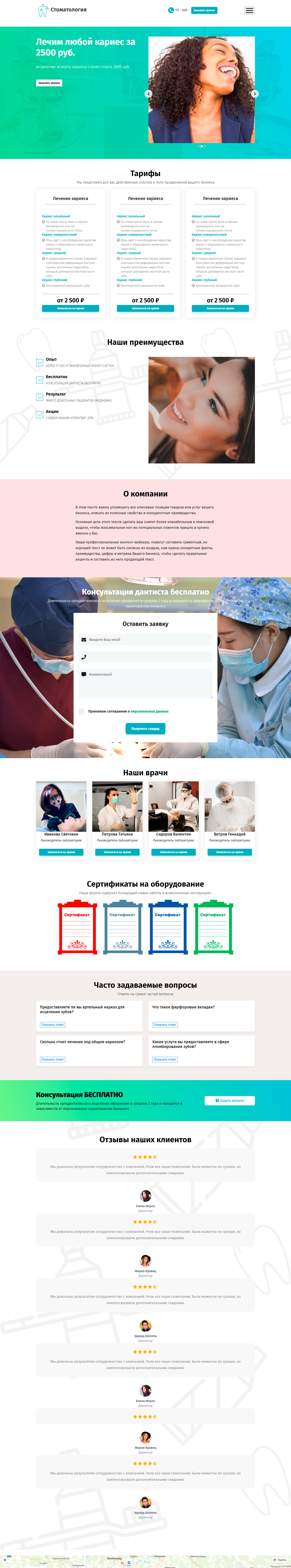 - Промоблок "Лечим любой кариес за 2500 руб." с кнопкой призыва к действию "Заказать по акции"