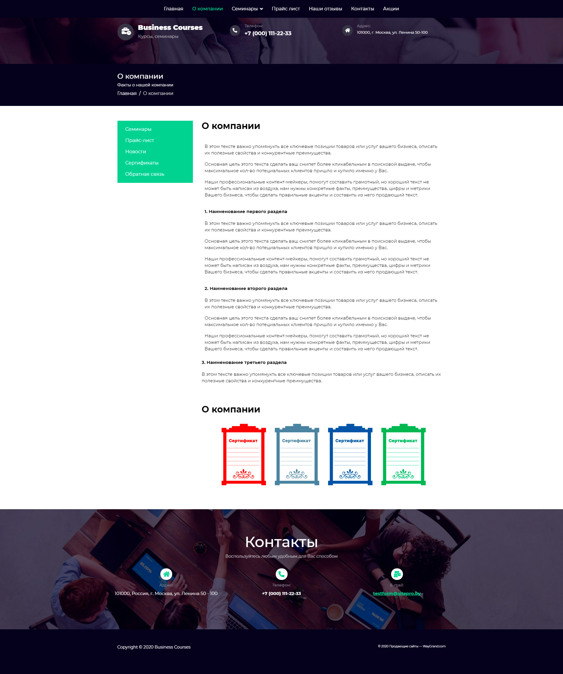 - Промогалерея "Бизнес курсы, семинары" с кнопкой призыва к действию "Обратная связь"
