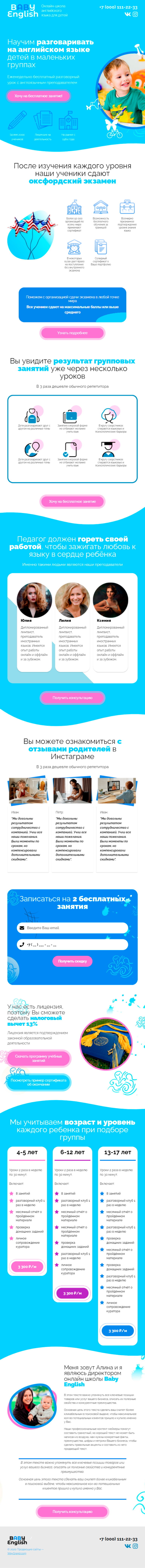 - Промоблок "Научим разговаривать на английском языке детей в маленьких группах" с кнопкой призыва к действию "Хочу на бесплатное занятие"
