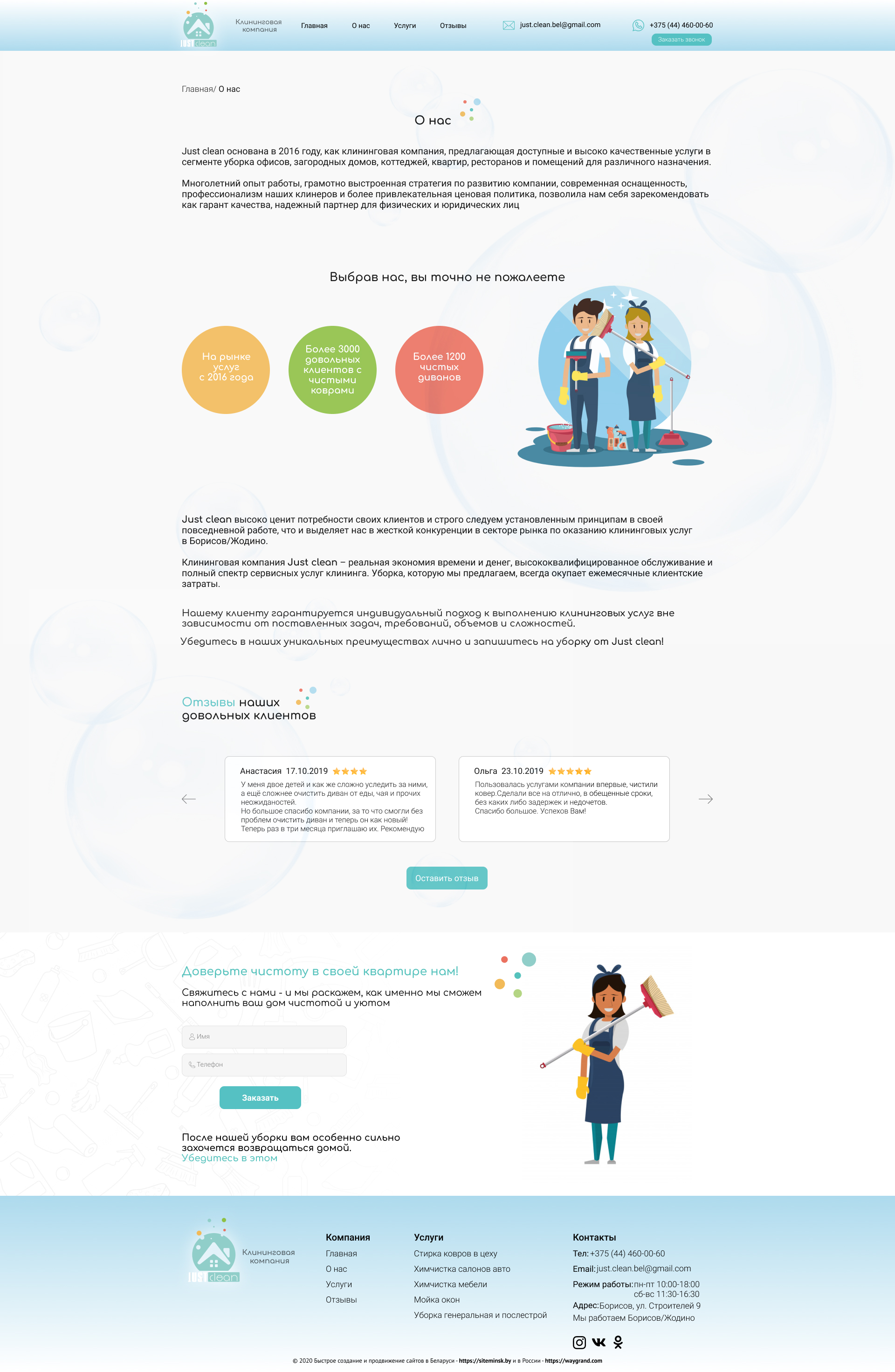 Обратился в данную компанию за разработкой сайта для моей организации. Мы занимаемся оказанием клининговых услуг. Сайт оказался легким, информативным, лаконичным. Легок в управлении. Остался всем доволен. Выражаю огромную благодарность в помощи создания сайта.