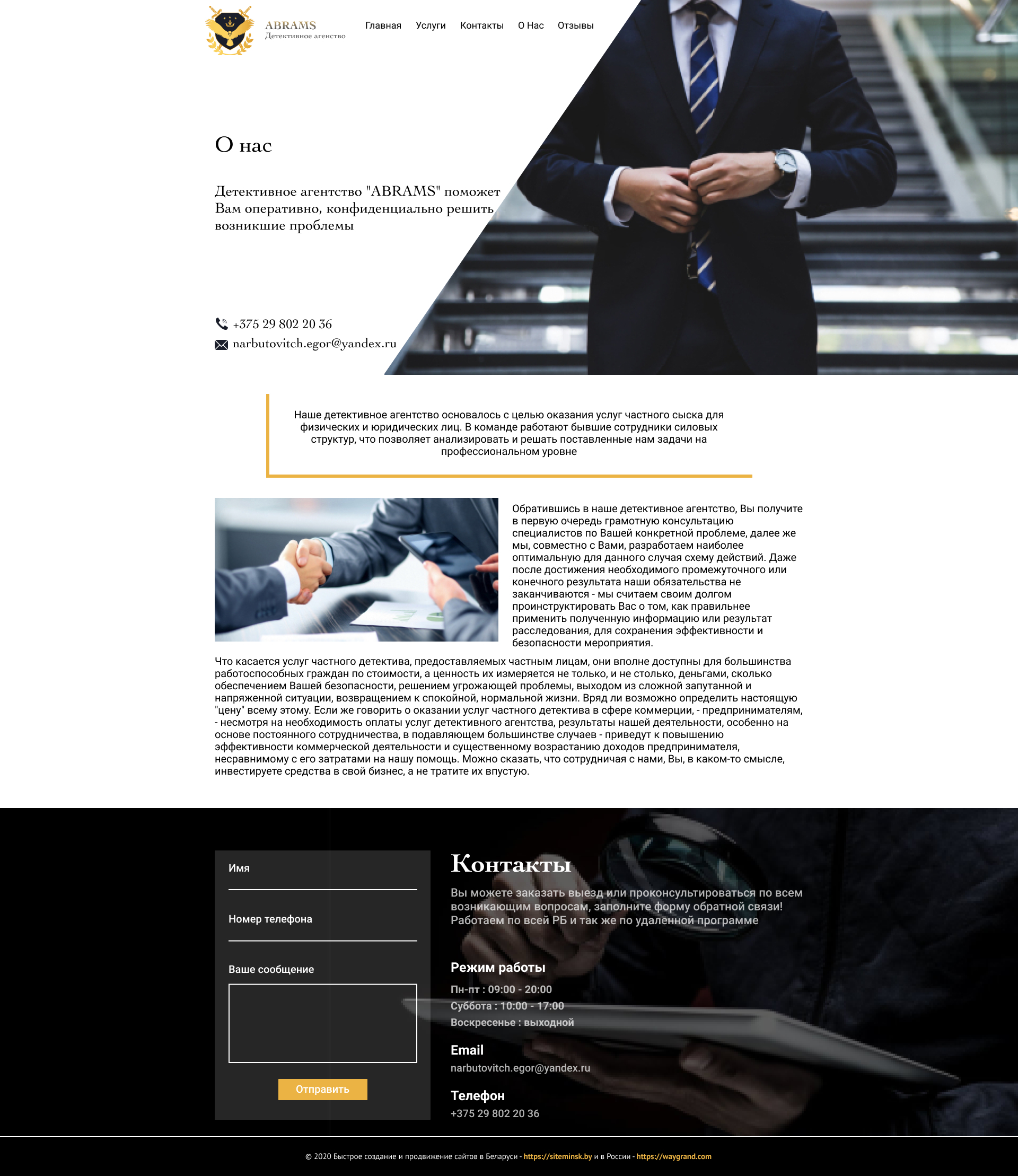Закажите готовый продающий сайт визитка #239 в Элисте за 5-7 дня «под ключ»: свёрстан, отрисован и готов к рекламе. Тематика шаблона «Частное детективное агентство».